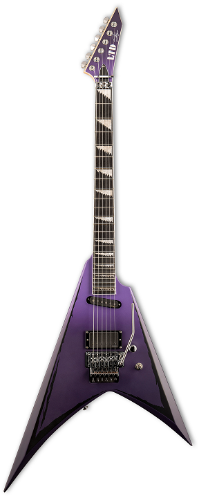 Capturing the essence of one of the world’s most beloved and influential figures in metal music, the LTD Alexi Ripped is among the final guitars designed by Children of Bodom/Bodom After Midnight frontman Alexi Laiho. The LTD Alexi Ripped is offered in an offset V shape with neck-thru-body construction at 25.5” scale. It features a three-piece thin u-shaped maple neck with natural satin finish for smooth and fast playability, alder body wings, and a Macassar ebony fingerboard (scalloped from frets 19-24) with 24 extra-jumbo frets, sawtooth inlays, and glow-in-the-dark side markers. The Alexi Ripped model is the first Alexi Laiho Signature Series guitar with more than one pickup. It includes an EMG HZ F-H2 passive humbucker in the bridge position for high-gain presence and clarity with a punchy response, as well as an EMG HZ S2 passive stacked single coil in the neck, offering just the right mix of mids with a clear and full low end. Components on this outstanding guitar include Grover tuners, a double-locking Floyd Rose 1000 bridge, and chrome hardware including a volume control and an inset three-way pickup selector. Available in Purple Fade Satin finish with painted black satin “ripped” pinstripes, with matching back and sides. Includes deluxe ESP hardshell case