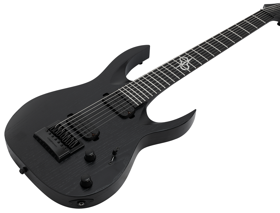 This Type A1.7 seven-string guitar boasts stealth looks, a distinctive cutaway scoop and a remarkable feature set, making it the ultimate, precise and professional instrument suitable for both stage and studio work. This guitar features the Evertune® constant-tension bridge—a reliable, fully-mechanical system that keeps the guitar in tune under any circumstances. It also features Duncan Solar pickups that provide a full spectrum of tonal options, from organic clean to heavily overdriven, all with fluid sustain and maximum clarity. The Type A1.7 features a set-thru neck/body joint design with 26.5” scale, an swamp ash body, a fast, thin, comfortable maple neck, an ebony fingerboard with 24 stainless steel super-jumbo frets and luminlay ‘glow in the dark’ side dots for easy stage use. Loaded with Solar 18:1 locking tuners, graphite nut, five-way blade pickup switching and full access neck. Available in black open pore matte finish